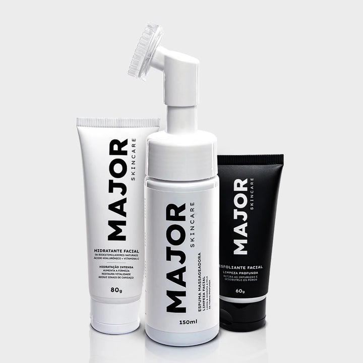 Skincare é o conjunto de cuidados diários que mantêm a pele limpa, hidratada e equilibrada. O Kit Skincare MAJOR reúne os três passos essenciais: limpeza (espuma), renovação (esfoliante) e hidratação (hidratante).
