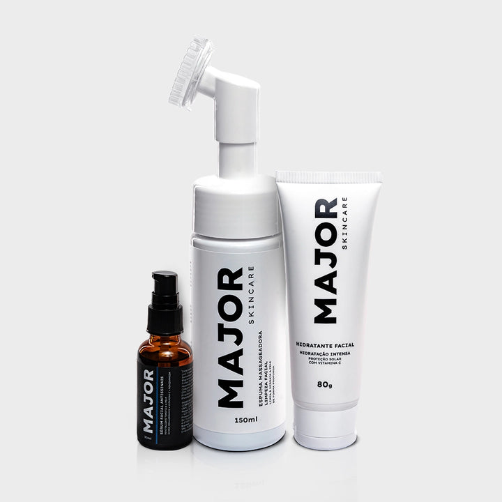 O kit reúne limpeza, esfoliação, hidratação e tratamento antioxidante/firmador para reduzir linhas finas, melhorar a textura e devolver viço, com rotina prática para uso diário.