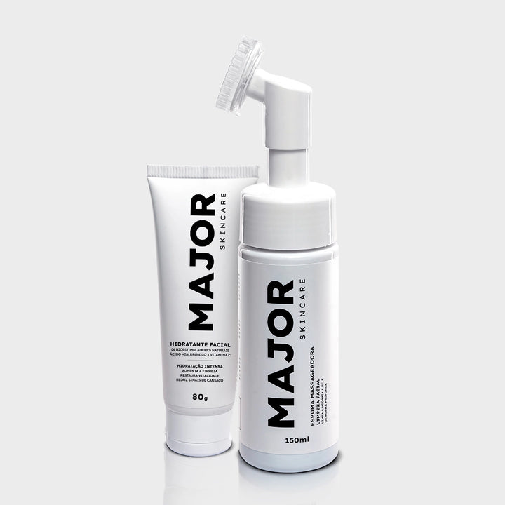 Skincare é o conjunto de cuidados diários com a pele para manter saúde, hidratação e equilíbrio. O Kit Cuidados Básicos MAJOR já reúne dois passos essenciais: limpeza profunda com a Espuma Massageadora e hidratação leve com o Hidratante Facial.